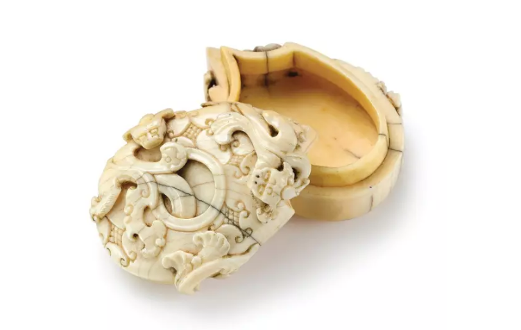 牙雕小盒,应由同一象牙雕成,採高古玉韘之式,浮雕螭龙成双,一螭沿壁而上,另一穿过韘中圆孔自底往上攀,爪均二趾,身缀横斑如虎,长尾分岔,毫髮毕现,韘则缀仿古变形勾云纹,繁而不褥。如此细腻之牙雕小盒,类例寥寥,却均展现了清初宫廷雕刻之工緻精巧,诚雅珍也。