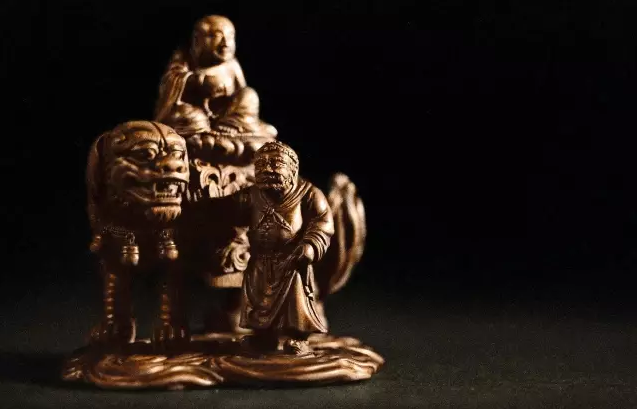 黄杨木雕菩萨面相慈祥庄严,斜披袈裟,右手持佛珠,左手置足后,结游戏坐。所乘佛狮,双目炯炯,口露僚牙,足踏利爪,毛髮蓬鬆,身缀鞍具饰缠枝莲花,攀胸垂铃、鞦坠穗子,细緻华丽。旁立胡人毛髮曲卷,鬆衣宽袖,上身繫纽,结领襟前,左手挽袍,右手前伸牵狮,双脚下承流云轻卷,底镌隶书御赞,并以纪年、印章作结。整体工细入微,眼目添墨点睛,出神入化,如菩萨乘狮腾云而至,弘扬佛法深义。