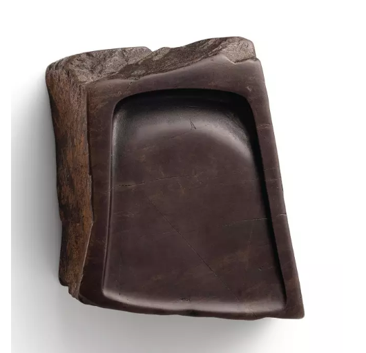 端砚小巧袖珍,砚色黝紫,半璞半雕,应以籽石稍加修整而成,上敛下侈,随形呈凤字,受墨处微洼下成墨池,砚背光素无纹,中央微洼,侧壁尚留泛红石皮,古朴天真。把玩掌中,意趣无限,置于案桌,儒雅溢涣。