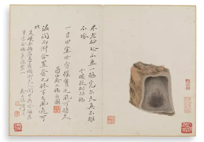 此端砚朴古凝思,得张廷济青睐题字以咏,又让陶琯请求蒋宝龄製图册以记,或更启发徐小圃另製砚册,拓录所藏五云双星砚,近二百年来传承脉络清晰有绪,录载一众文士朴韵,延宋人雅风,续惜砚珍古之情。