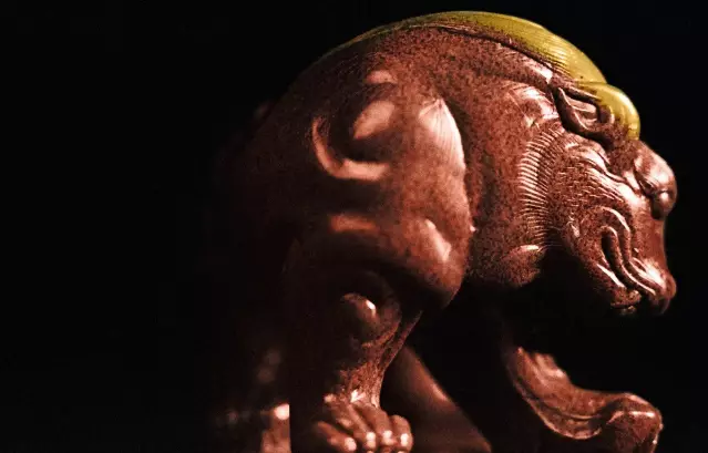 寿山质,带珠砂点。见方,无印文。雕瑞兽为钮,瑞兽挺立,半回首,双目炯炯。毫髮丝丝分明,四肢雄壮有力,威风凛然,生动传神,应出自宫廷巧匠之手。工匠巧妙地利用石天然之色,雕琢髦髮,浑然天成,匠心独运。