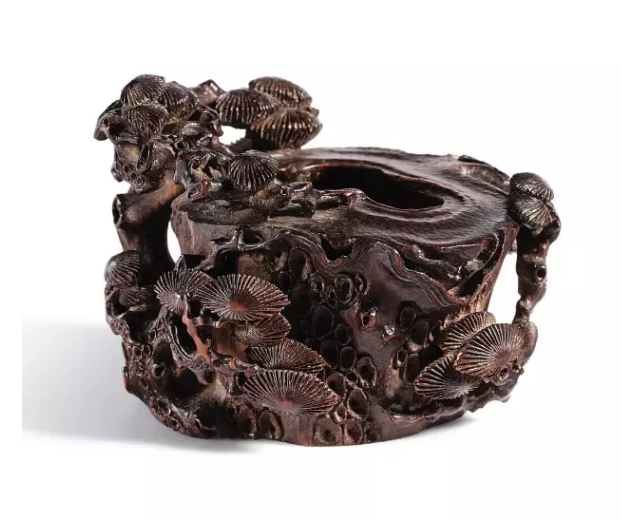 圆雕水丞,作苍松古朴,盘曲遒劲,鳞皴瘿节,镂空层次分明,栩栩如生,包浆滋润,意趣天然。小巧玲珑,恰宜掌中把玩细味,雅置文房案桌,既为实用,也可清赏,为书斋添趣。