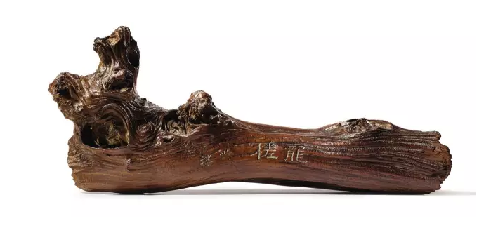 一节古杉,一段故事。曾顶立九嶷山上舜帝祠前,见证春秋更迭,本欲长伴舜陵,却遭稗官藉词诛灭,所遗片木残枝,难得倖存,转折入佛门,清僧命名镌铭,以逾百字,记载古人对贤君之崇敬、对树伐之惋惜、对同好之情谊、对罕物之锺爱,流传至此,诚为缘也。昔时巨杉,今日龙差,清供案上,古雅引思,让人不禁神游天地,遥想古今韵事。