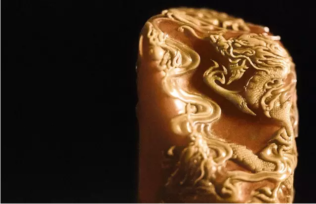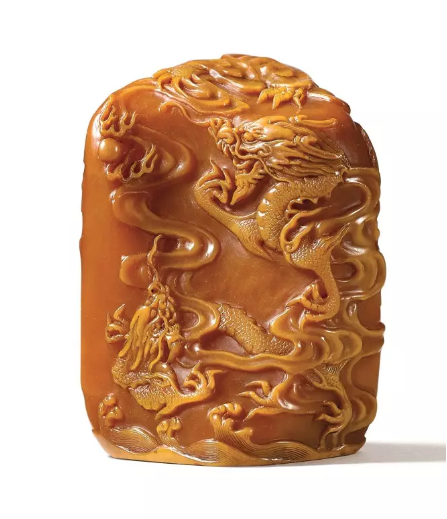 本品硕大,巧手活雕,印牆阳文雕著名书法家林佶印款,可算清初田黄石雕至臻。腾龙戏珠,生动灵活,画意浓溢,工匠细工慢琢,将绘画精神转化到三维圆石上,然不失原材独有特质,巧妙创思,尽显清初匠人鬼斧神工之技。