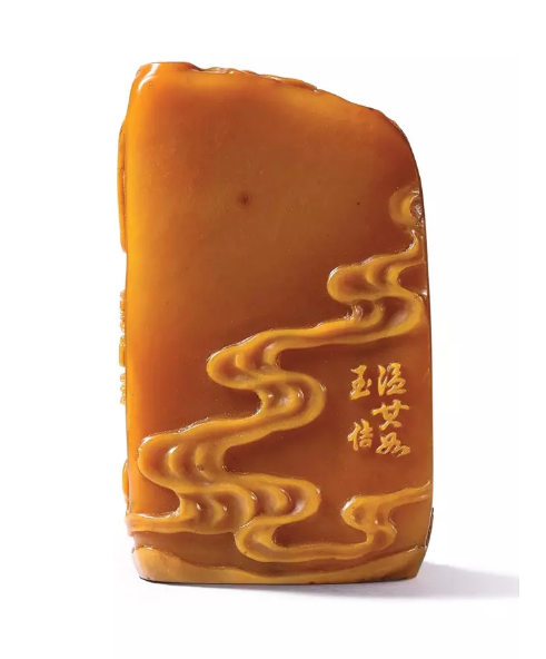 印身保留原石雏形,因材而施,别具匠心,通体浮雕,自然流畅,起伏有致,犹如绘画。如斯处理手法,与传统有别。清初以前,不乏田石籽料,一印之成,多为破方雕钮。本品充分利用印身表面,施浅浮雕饰,取代传统印钮的装饰功能。